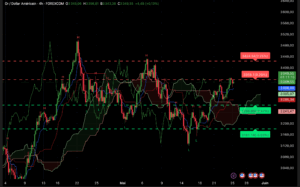 L’analyse du graphique en H4 met en lumière une configuration sans tendance claire. Le nuage Ichimoku agit comme zone de neutralité, maintenant le XAU/USD dans une phase de consolidation.